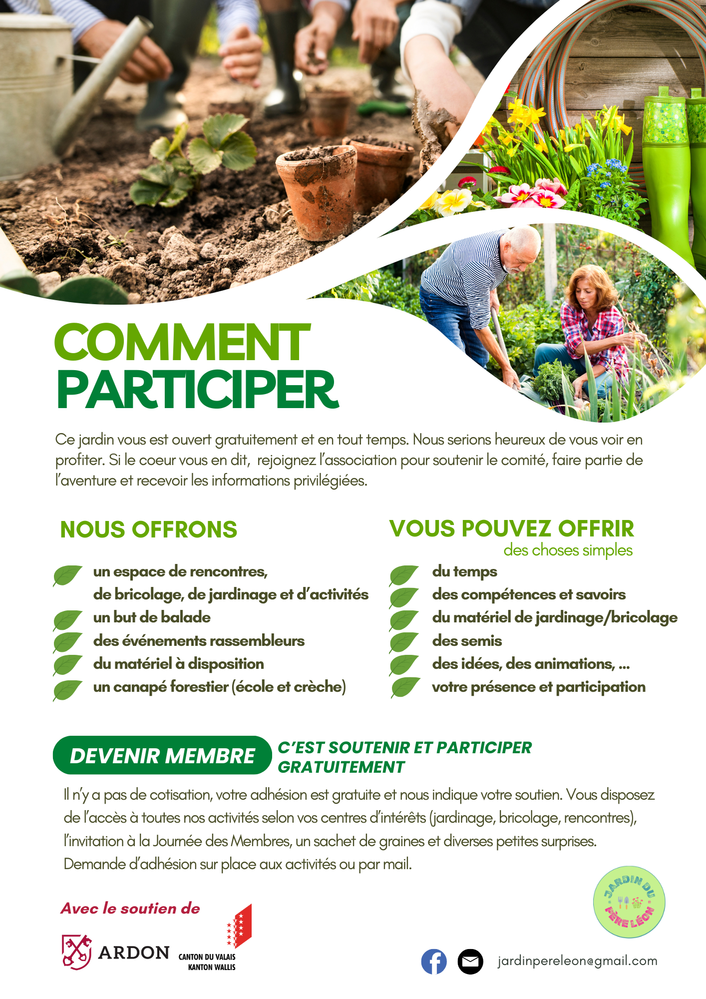 Ce jardin est un lieu de rencontres ouvert gratuitement et en tout temps. Il est un point de rassemblement pour toutes les générations du village. Son originalité consiste à mettre à encourager la participation des utilisateurs à s’en occuper et à en prendre soin (planter, arroser, bricoler, animer et se reposer). Journée plantation / Tricots-Cafés / habillage des arbres / construction de tipis ou de maisons pour insectes, hérissons, oiseaux / balade lumineuse / Notre association offre : - un espace de rencontres, de bricolage, de jardinage et d’activités - un but de balade des événements rassembleurs - du matériel à disposition - un canapé forestier (école et crèche) Vous pouvez offrir : - du temps - des compétences et savoirs - du matériel de jardinage/bricolage - des idées, des animations, ... - votre présence et participation - des choses simples Devenir membre, c’est nous soutenir et participer gratuitement (sans cotisation). Vous disposez de l’accès à toutes nos activités selon vos centres d’intérêts (jardinage, bricolage, rencontres). Notre but : tisser des liens entre les habitants, entre les générations dans un espace naturel qui allie bien-être, respect et créativité. Et semer des graines durables pour le vivre-ensemble.